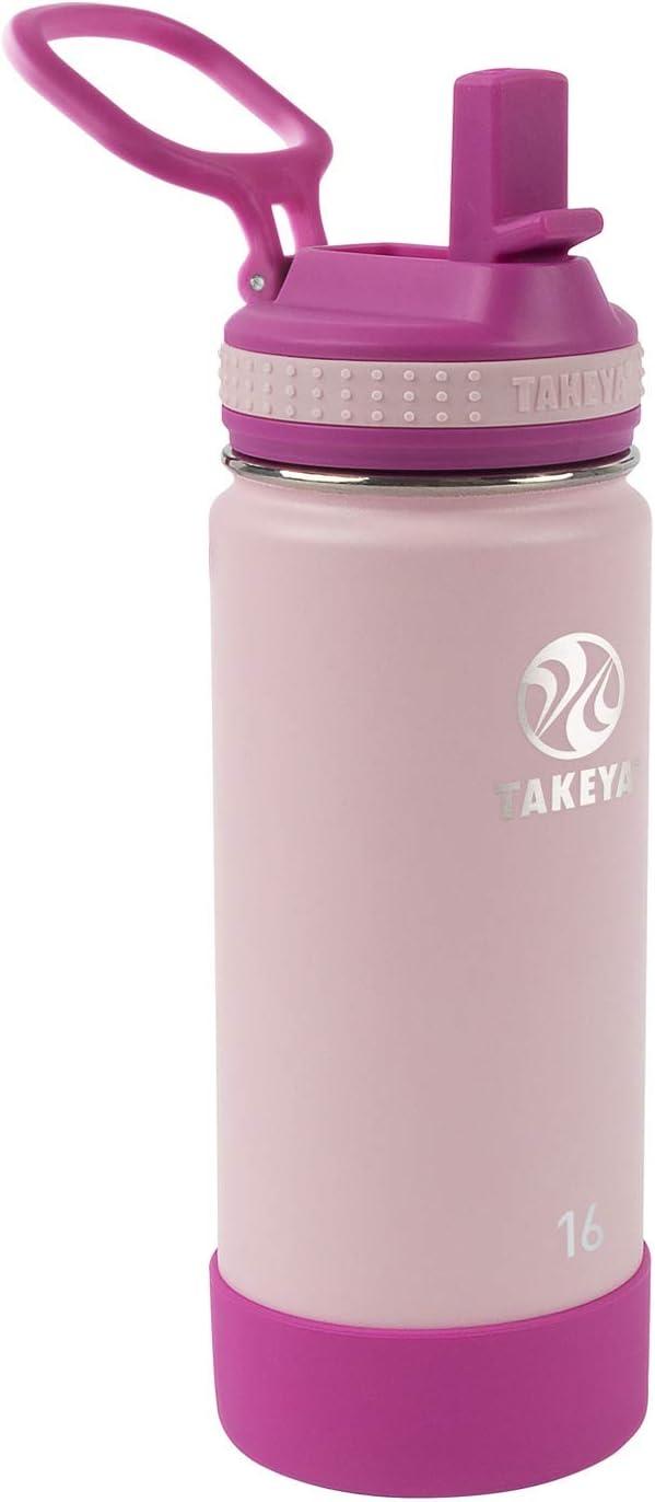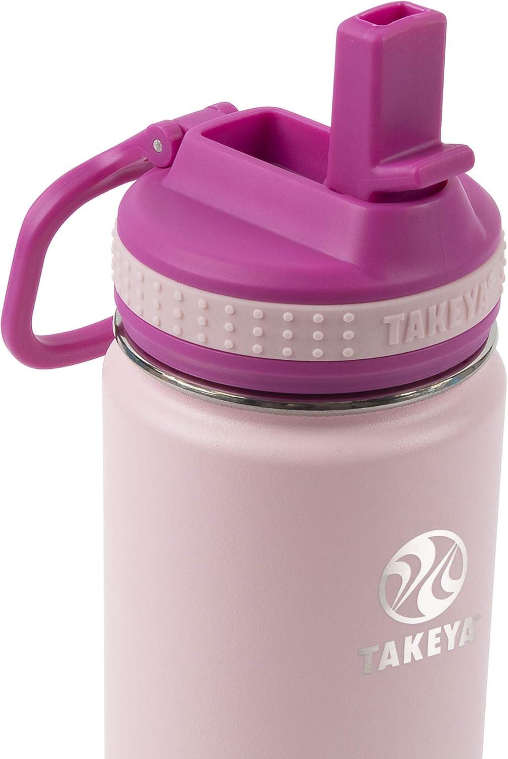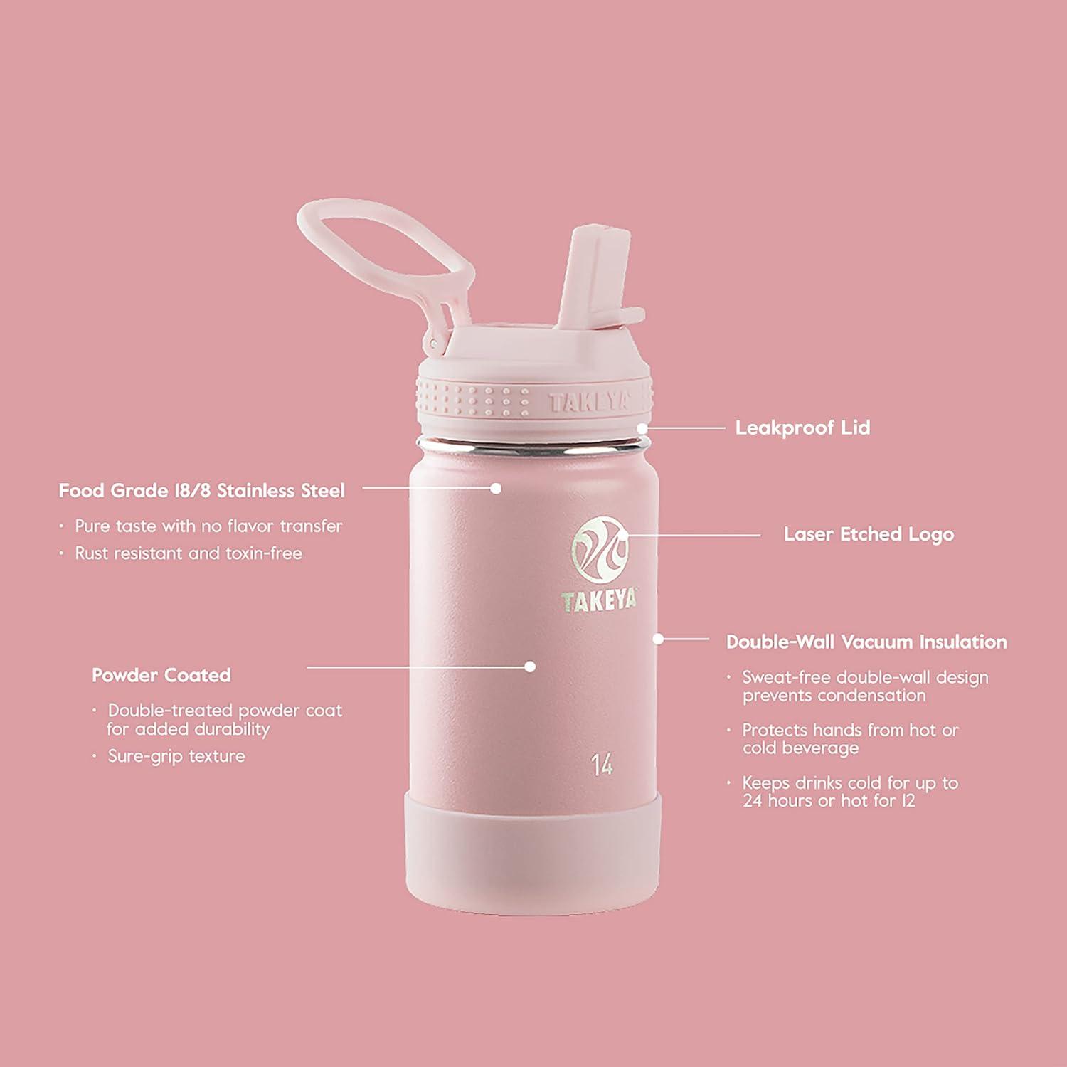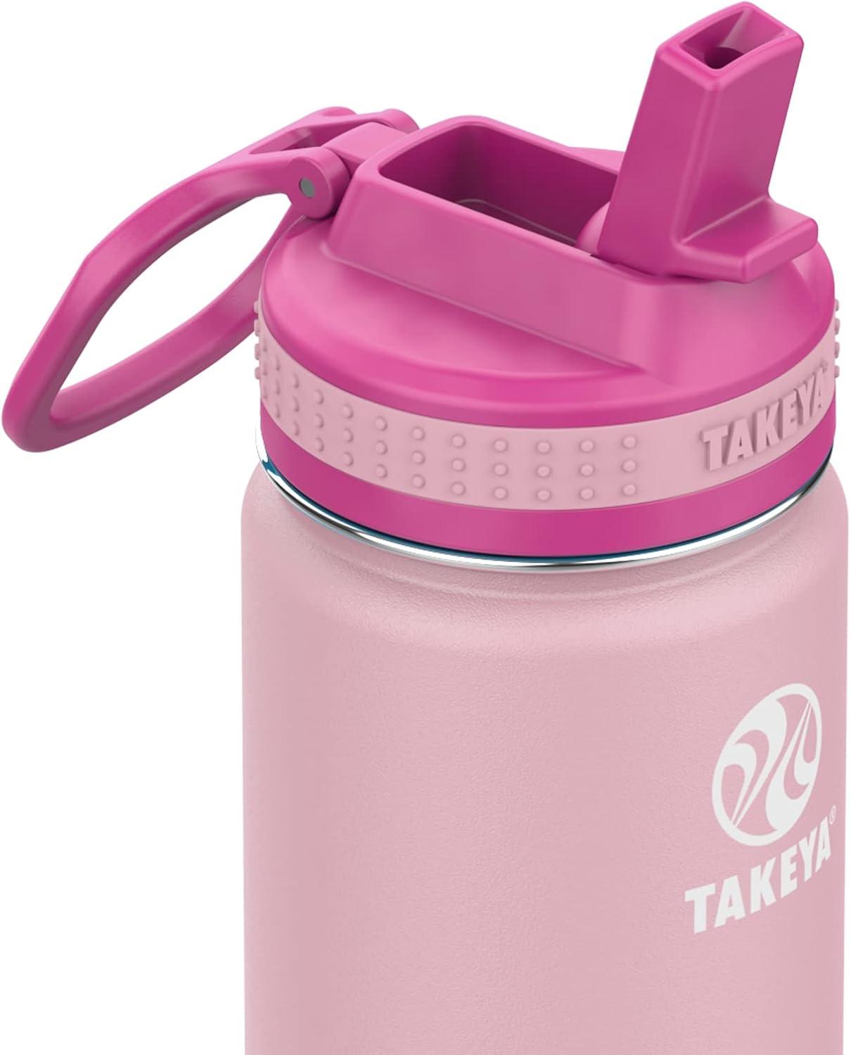 Takeya Actives Kids Water Bottle with Straw Lid – Stainless-Steel Double Wall Insulation – BPA-Free Bottle Lid with Carry Handle – Reusable Bottle with Straw Lid – 16 oz, Platinum/Onyx(Blush/Super Pink)